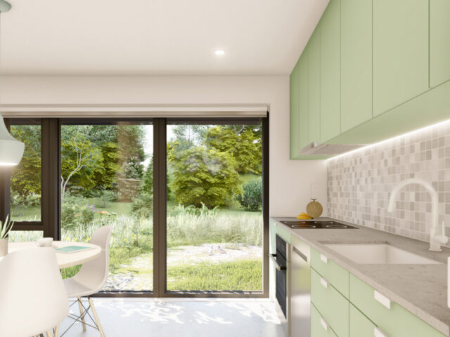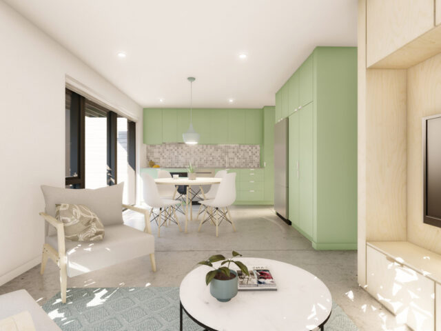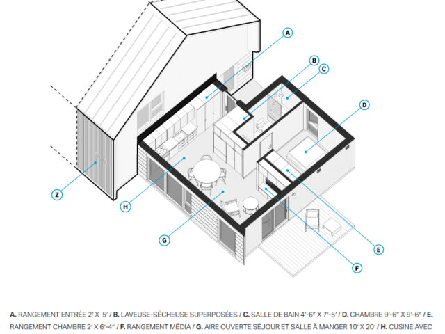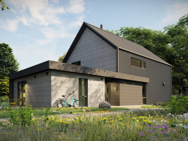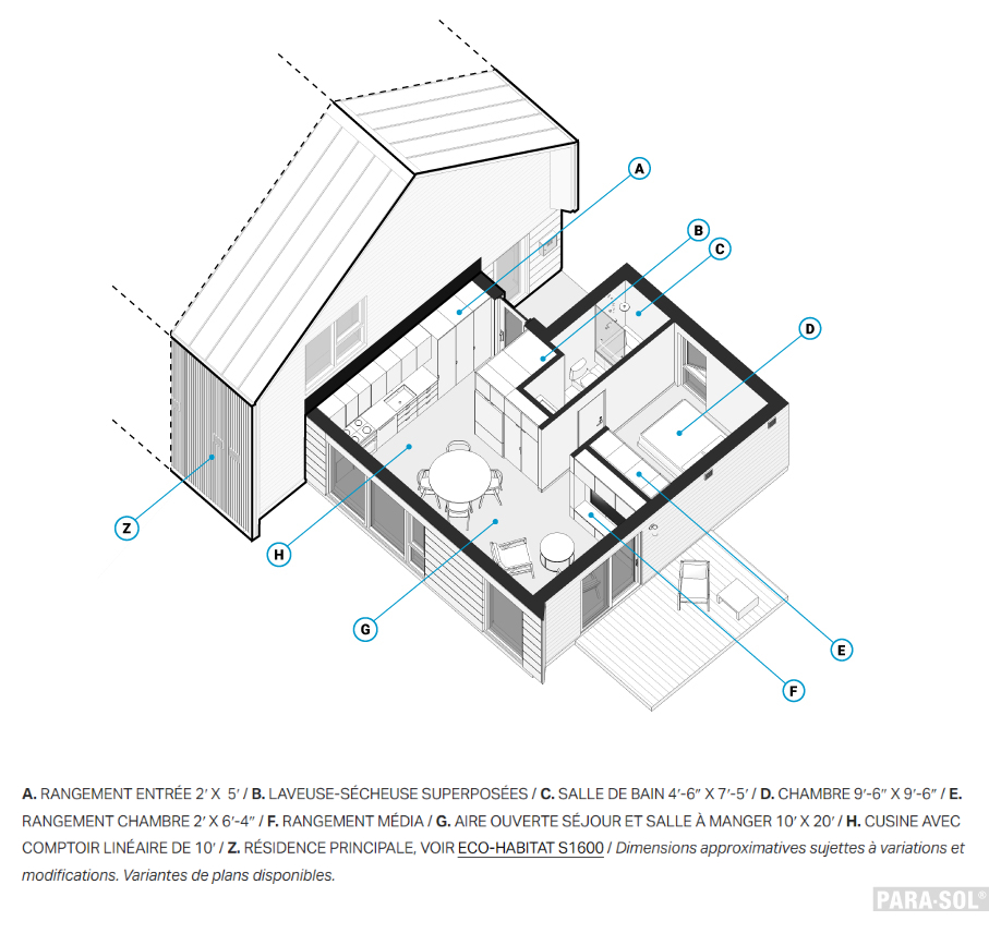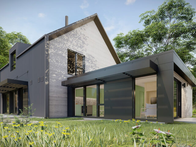 Variante du concept ÉCO-HABITAT S1600, l’ÉCO-HABITAT BIGÉNÉRATION est le fruit d’une collaboration entre PARA-SOL, firme d’architectes à Montréal et Bâtiment Pré-Fab et se caractérise par un agrandissement latéral permettant l’ajout d’une unité d’habitation accessoire.